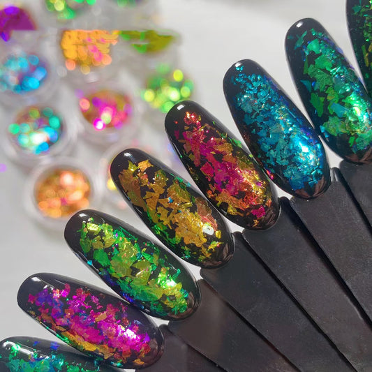 Using Flakes enhances the beauty of nail art, as the pigment is compatible with various formulas due to its insolubility in water and most liquids.